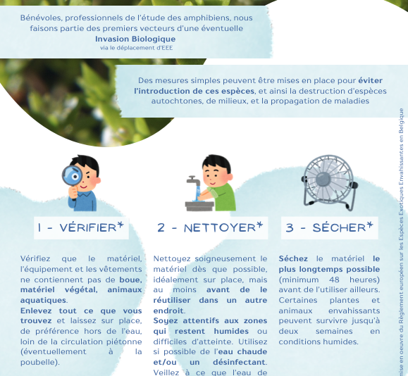 En nous déplaçant d’une mare à l’autre lors de prospections, nous sommes susceptibles de participer à la dissémination d’espèces exotiques envahissantes (EEE). Quelques mesures simples à mettre en oeuvre pour éviter ces propagations accidentelles sont détaillées dans cette fiche. TÉLÉCHARGER LA FICHE